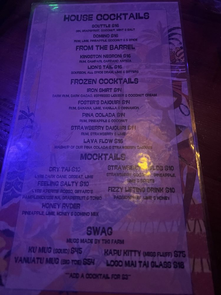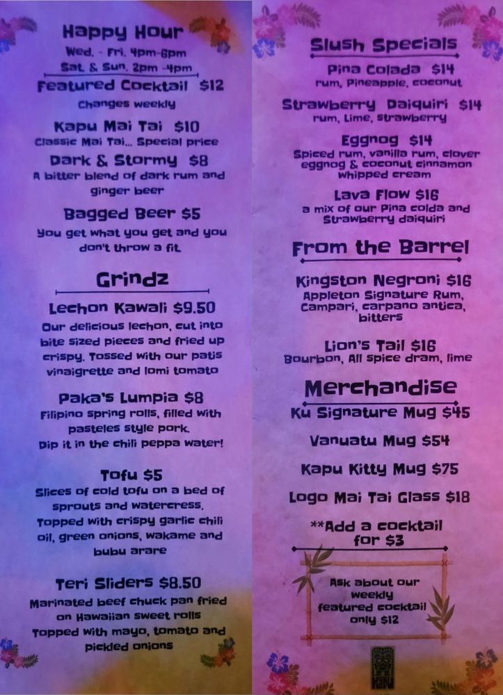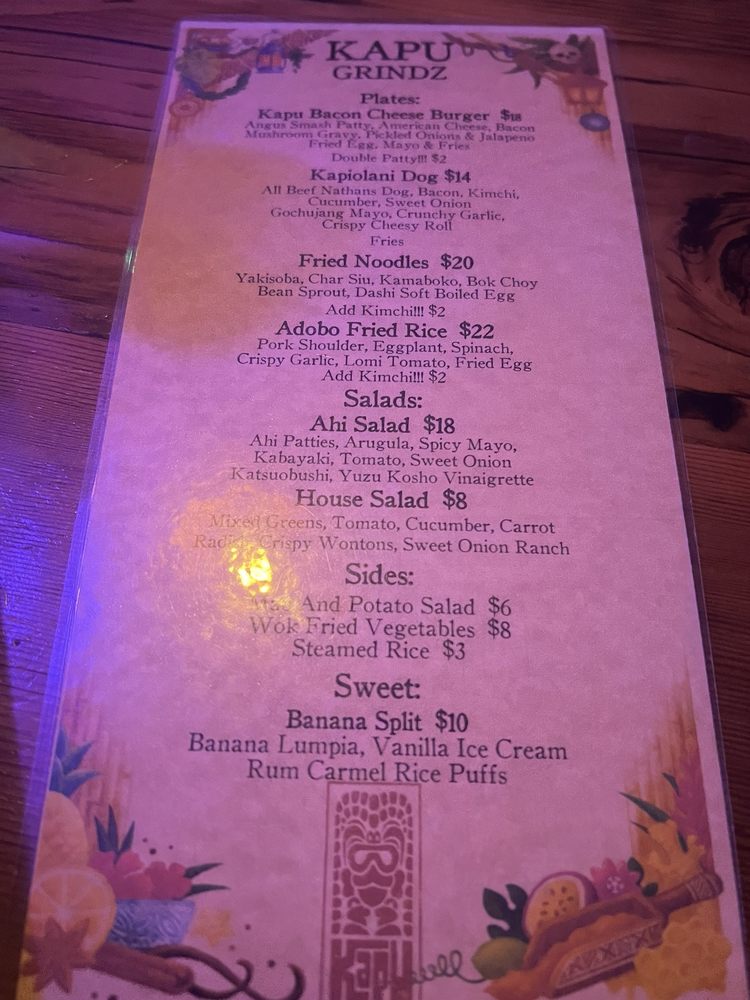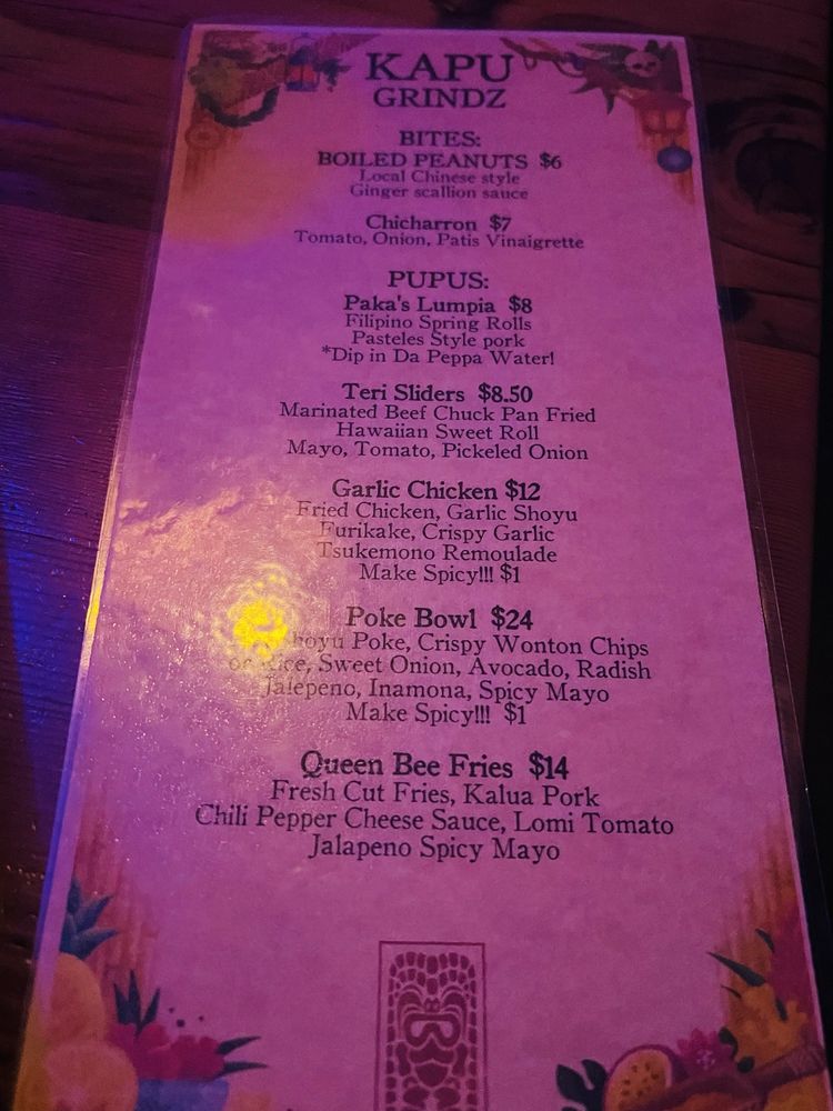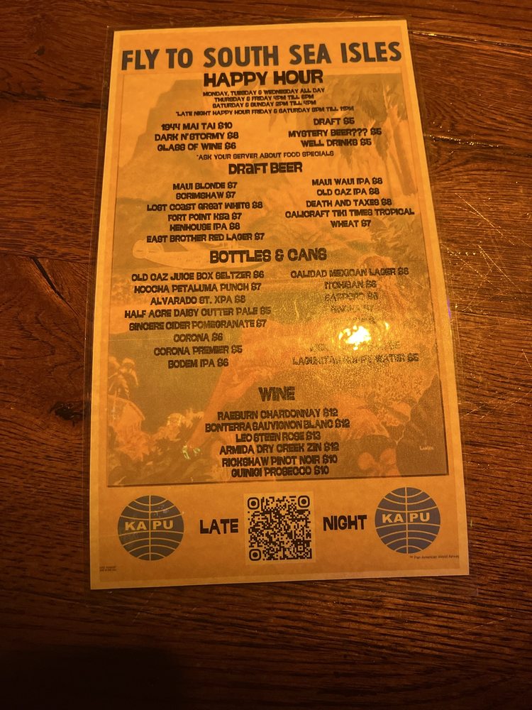 Introducing Kapu Bar, a trendy Tiki Bar located in Petaluma, CA. This cocktail bar offers a unique island ambiance with friendly staff and delicious drinks. Customers rave about the frozen seasonal cocktails like the egg nog and mai tai, along with a refreshing whiskey, lemon, and cucumber concoction. The bar provides an inviting tropical atmosphere, perfect for happy hours and group gatherings. With a full bar, outdoor seating, and pool table, Kapu Bar caters to a diverse crowd looking for a fun and vibrant experience. The food menu, although limited, offers tasty options like hot dogs and spam masubi. Don't miss out on the live music events and free parking nearby. Overall, Kapu Bar is a must-visit destination for a memorable night out in Petaluma.